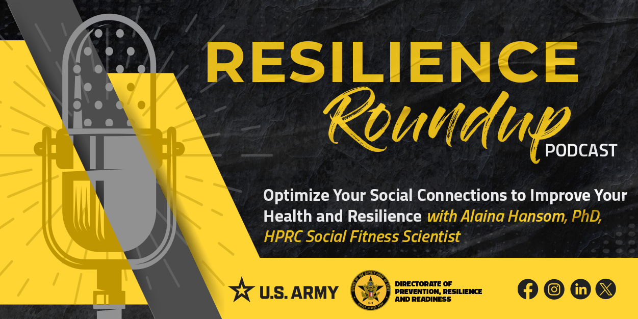 The Resilience Round Up Podcast is a monthly podcast series that offers resources to help Soldiers maintain resilience. We know that the Army can be a tough profession. This podcast will help Soldiers not just cope, but learn, grow and thrive. Dynamic speakers will present helpful information in a more conversational style setting. The podcast will serve as a forum for discussing the latest research, policies and tools. Remember, you are RESILIENT!